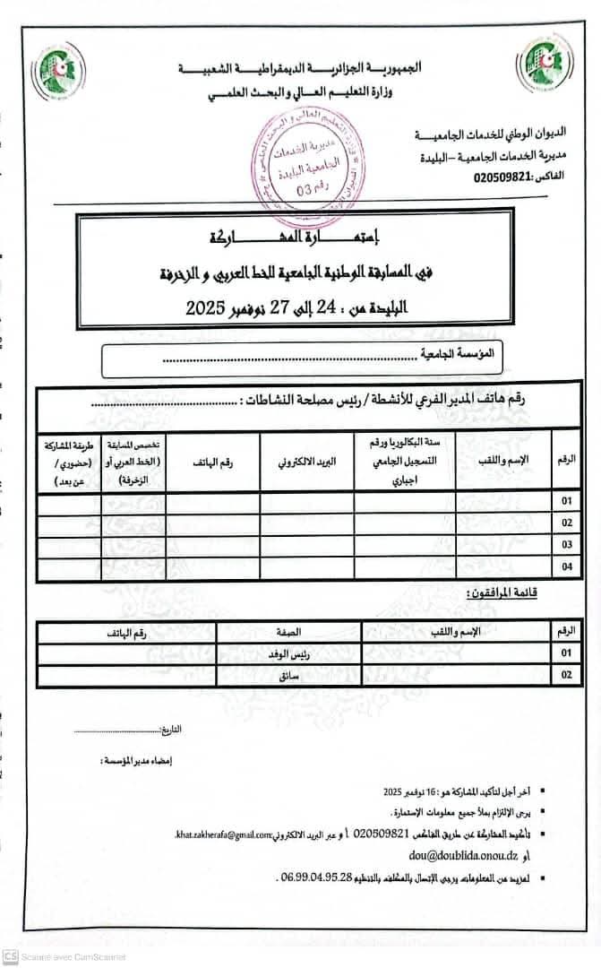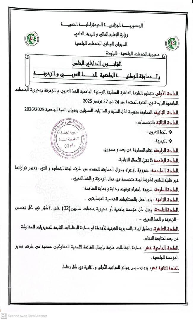 المسابقة الوطنية الجامعيةللخط العربي و الزخرفةPar zouatenia mhamed / 28/10/2025 تحميل قانون الداخلي إستمارة المسابقة